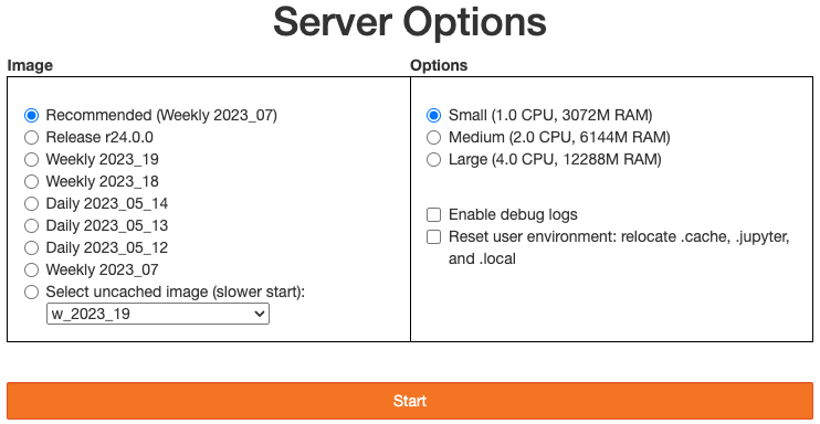 RSP users who are doing a lot of image processing might need to select a large server, and those who are working with small subsets of catalog data can use a small server.